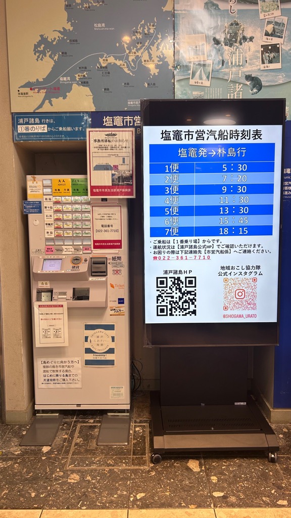 まずは「マリンゲート塩釜」1階と「塩竃市津波防災センター」1階の自動券売機にて乗船券をお買い求めください。