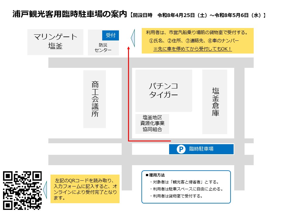 浦戸諸島|宮城県塩竈市【公式】 ホーム 新着情報一覧 新着情報 浦戸観光客・帰省客用無料駐車場を開設します。浦戸を訪れる観光客や帰省される方のために、期間限定で無料駐車場を開設いたします。・開設期間 令和8年4月25日(土)~ 令和8年5月6日(水) ・場所と台数 パチンコタイガー塩釜店向い 28台分・受付方法 利用者はQRコードから申込 予約はコチラからも行うことができます。⇨予約フォーム